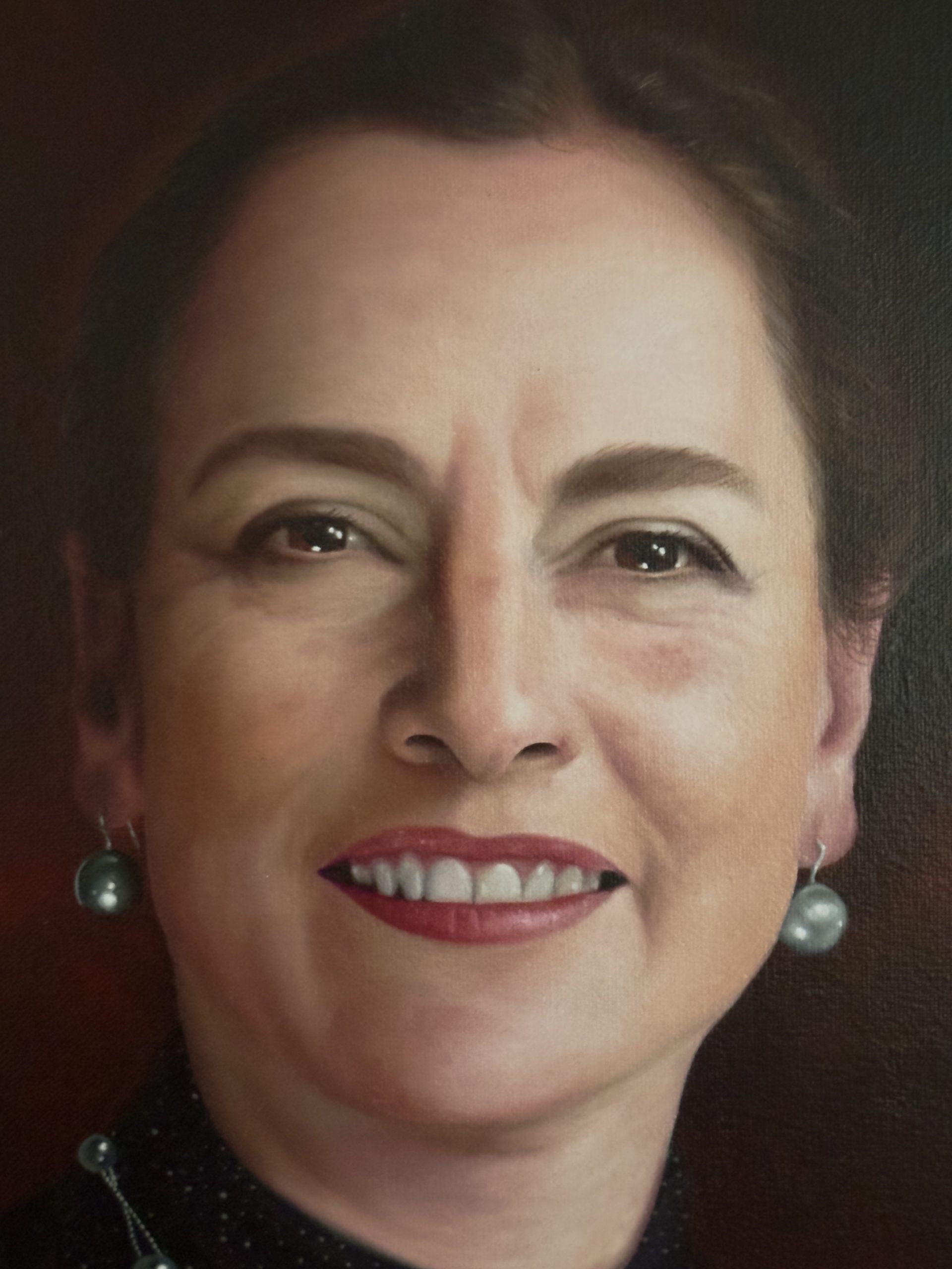 Una atmósfera de distinción intelectual envuelve este magnífico retrato firmado por el maestro Sergio González, quien nos entrega una representación de la doctora Beatriz Gutiérrez Müller ejecutada con una delicadeza técnica que roza la perfección. Lejos de la frialdad académica, la obra respira vida gracias a un tratamiento de la luz exquisitamente dirigido; la iluminación baña el rostro desde un ángulo lateral superior, esculpiendo los pómulos y la frente con una suavidad que evita los contrastes duros, logrando así que la piel irradie una calidez orgánica y verosímil. Es una pintura que no solo busca la semejanza física, sino capturar la vibración vital de la retratada.