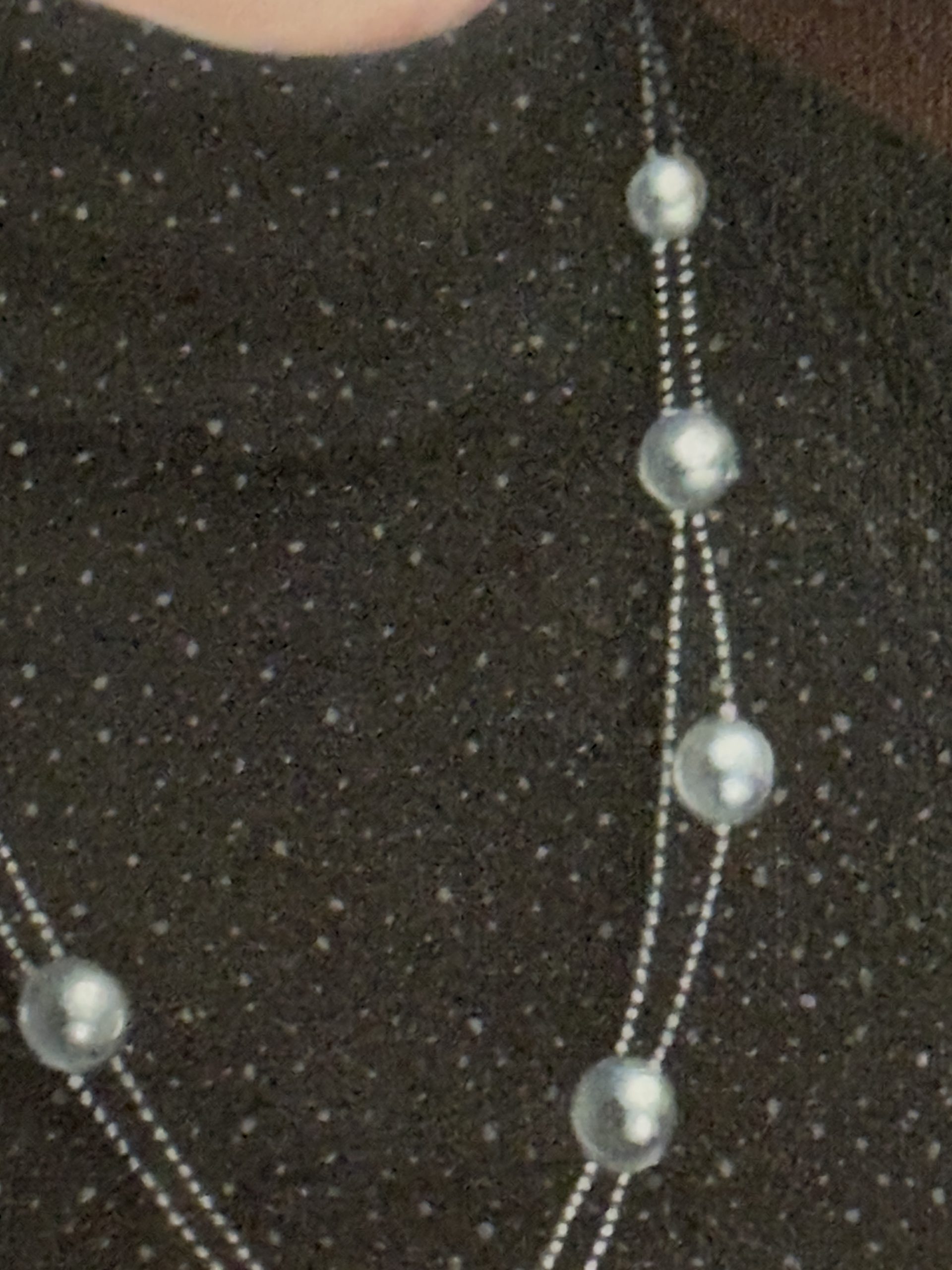 El orden visual de la obra descansa sobre una composición clásica de busto, donde la figura emerge con autoridad estética de un fondo en penumbra con matices caoba y rojizos, un recurso que potencia la luminosidad de la carnación y la sobriedad del atuendo. La paleta cromática es un estudio de contrastes refinados: el negro profundo de la vestimenta, salpicado por una textura sutil que sugiere un tejido de punto con destellos discretos, sirve de base para que resalten con fuerza las perlas de los aretes y el collar. González ha pintado estas joyas con una maestría particular, capturando el nácar y sus reflejos lechosos como puntos de luz que guían la mirada del espectador a través del lienzo.