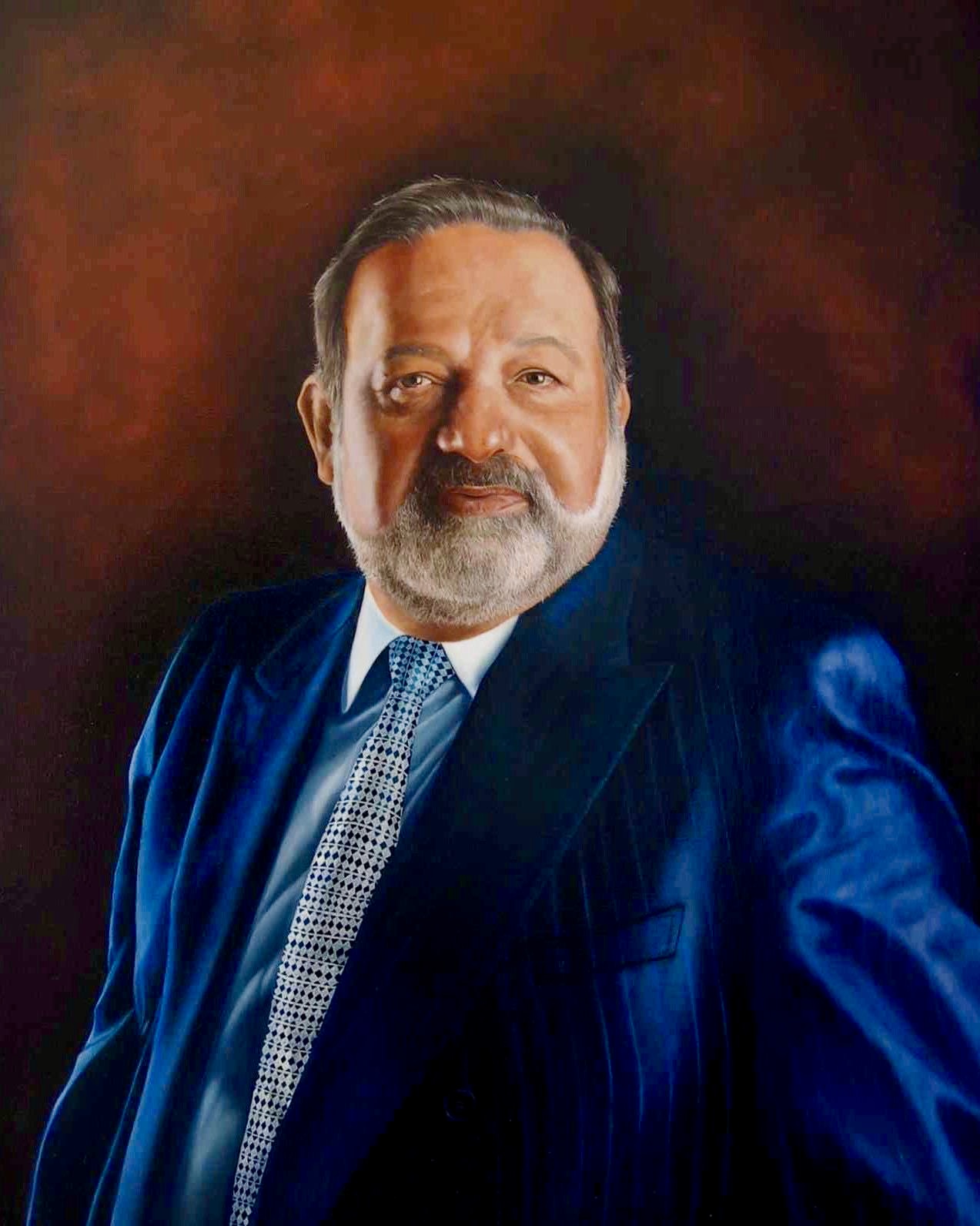 En el distinguido ámbito del arte figurativo contemporáneo, este retrato de encargo, realizado por el maestro Sergio González, se erige como una pieza de excepcional virtuosismo y resonancia histórica. La obra presenta al ingeniero Carlos Slim Helú con una ejecución técnica impecable, donde el tratamiento de la luz define la volumetría del rostro con una suavidad magistral, esculpiendo los rasgos de la edad y la experiencia sin caer en el artificio. La iluminación incide de manera lateral, resaltando la nobleza de la frente y la textura de la barba cana, otorgando a la figura una tridimensionalidad que parece desafiar la planitud del lienzo y establecer una presencia viva ante el espectador.