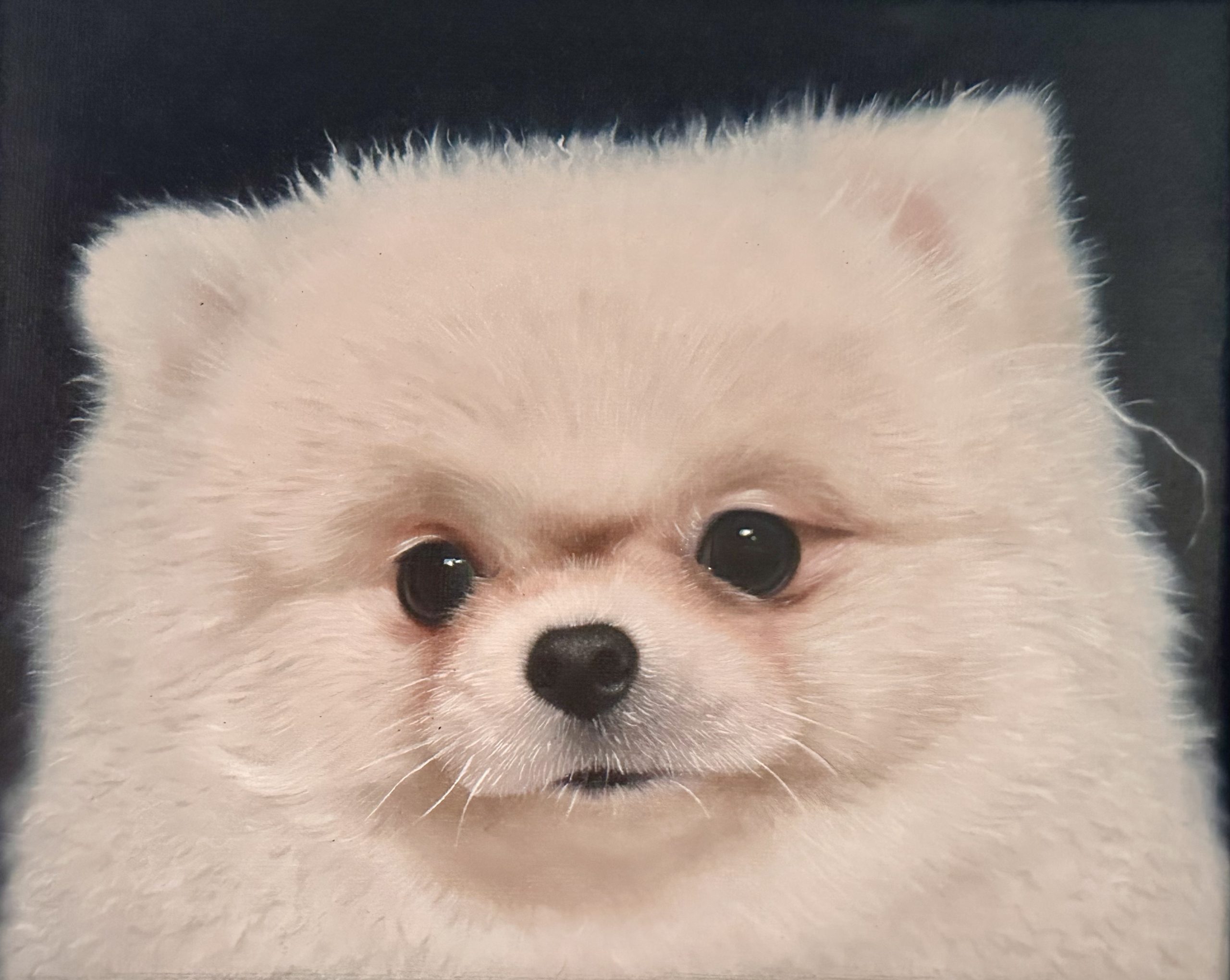 La composición se distingue por una centralidad equilibrada y un fondo oscuro y profundo que, por contraste, potencia la blancura inmaculada del protagonista. El tratamiento de la textura es, indudablemente, el punto focal de la ejecución técnica; la pincelada se disuelve para emular la consistencia de una nube o de algodón, logrando una sensación táctil de esponjosidad extrema. La armonía cromática es de una sobriedad elegante, dominada por una gama de blancos cálidos y cremas que se ven interrumpidos únicamente por la geometría precisa y oscura de la nariz y los ojos, creando un anclaje visual de gran fuerza en medio de la suavidad general.