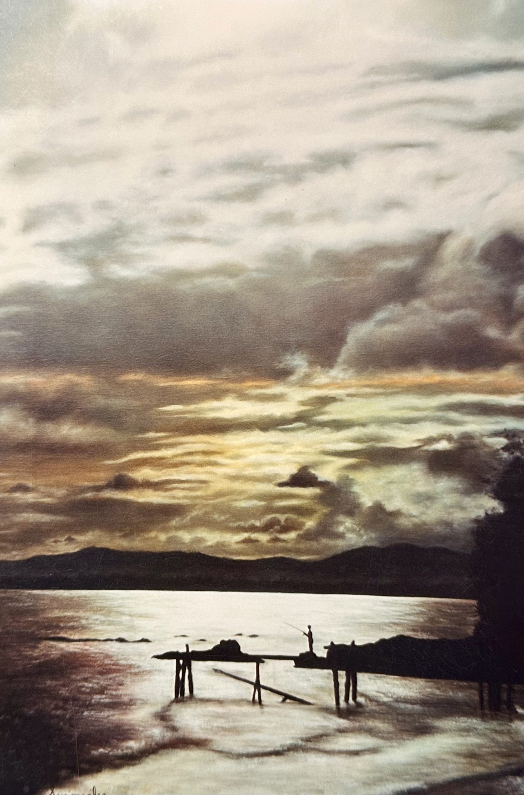La obra destaca por su dominio del cielo, que ocupa casi dos tercios del lienzo. La línea del horizonte, marcada por montañas oscuras, divide la escena y dirige la mirada hacia la pequeña silueta del pescador sobre el muelle, acentuando la inmensidad del entorno frente a la escala humana.