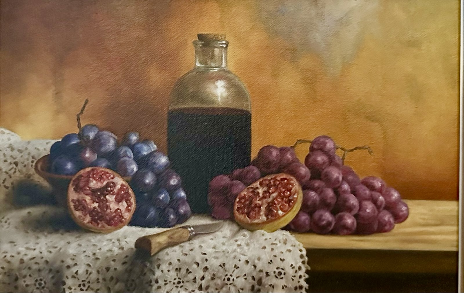 La obra presenta una disposición clásica y equilibrada. El centro visual lo ocupa una botella de cristal con líquido oscuro, flanqueada por racimos de uvas y granadas abiertas. La inclusión de un mantel de encaje intrincado y un cuchillo con mango de madera añade dinamismo y guía la mirada a través de la escena.