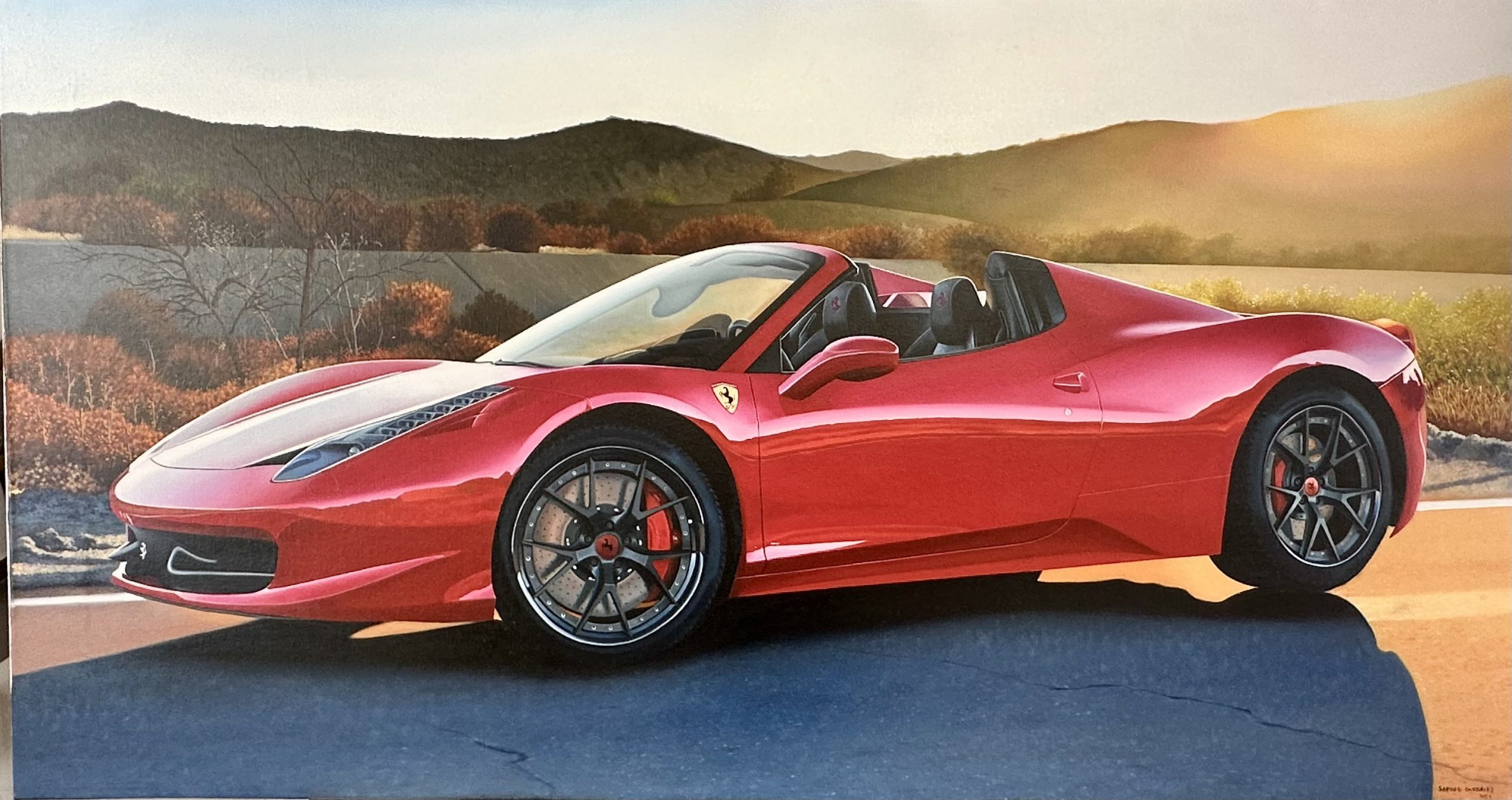 En esta evocadora pieza del realismo contemporáneo, el maestro Sergio Gonzalez fusiona la precisión de la ingeniería automotriz con la poesía atmosférica del paisaje. La obra captura al Ferrari 458 Spider inmerso en la «hora dorada», un momento transitorio donde la luz solar, baja y cálida, baña la carrocería con una intensidad vibrante. El artista demuestra un dominio magistral de la luminiscencia; los rayos del sol poniente no solo iluminan, sino que incendian el rojo del vehículo, creando degradados que van desde el carmesí profundo hasta el naranja incandescente, modelando las curvas aerodinámicas con una suavidad orgánica que contrasta con la rigidez del metal.