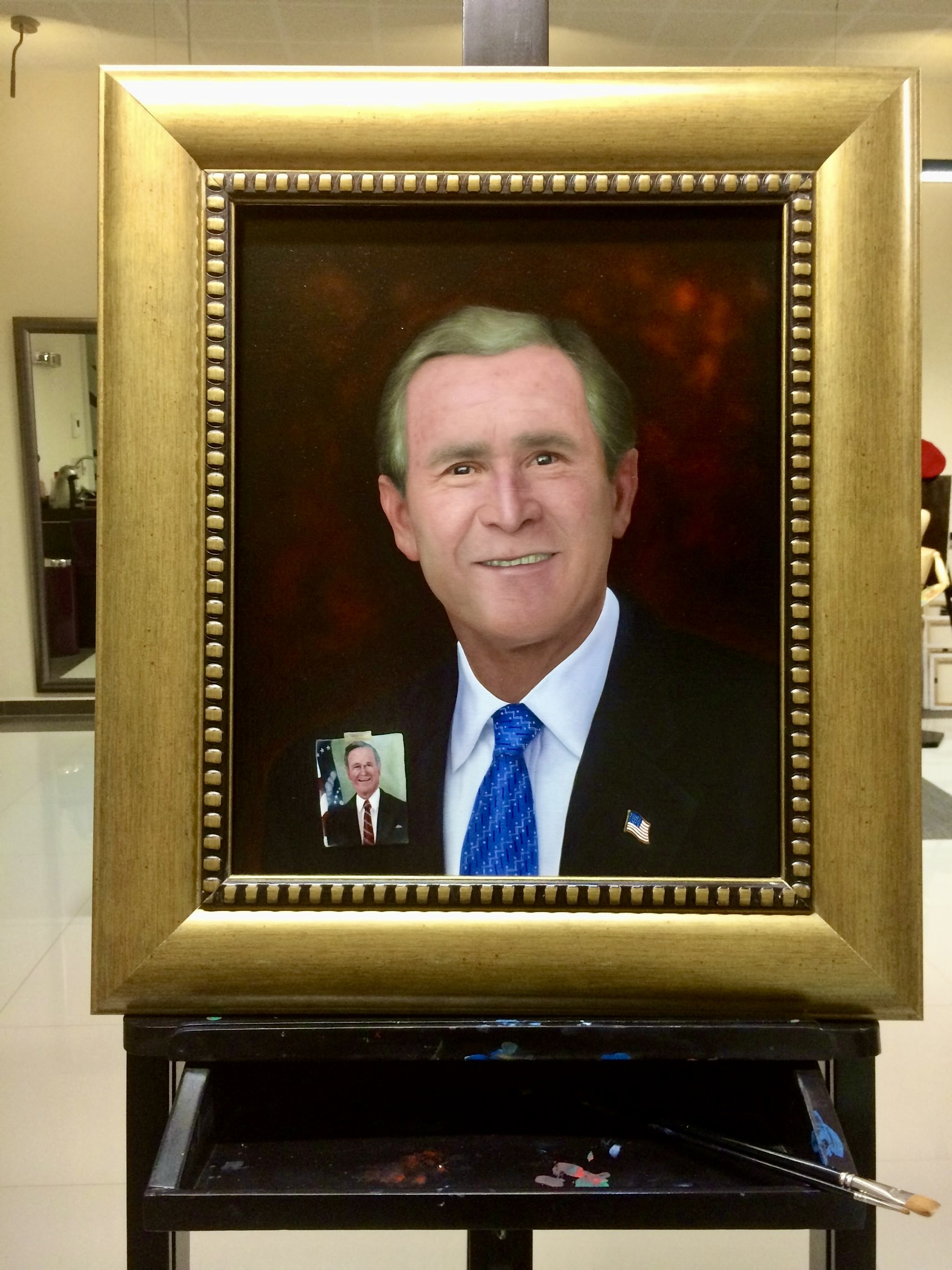 Este lienzo del maestro Sergio González se articula como una narrativa visual compleja sobre la genealogía del poder y la herencia política. La obra retrata al expresidente George W. Bush con una solvencia técnica que desafía la planitud del soporte; la luz baña al mandatario con una claridad meridiana, modelando los surcos de su rostro y la firmeza de su expresión con un realismo que otorga a la piel una calidad táctil y vibrante. El artista logra establecer una diferenciación lumínica sutil entre la figura viva del hijo y la representación estática del padre, creando capas de realidad dentro de la misma superficie pictórica.