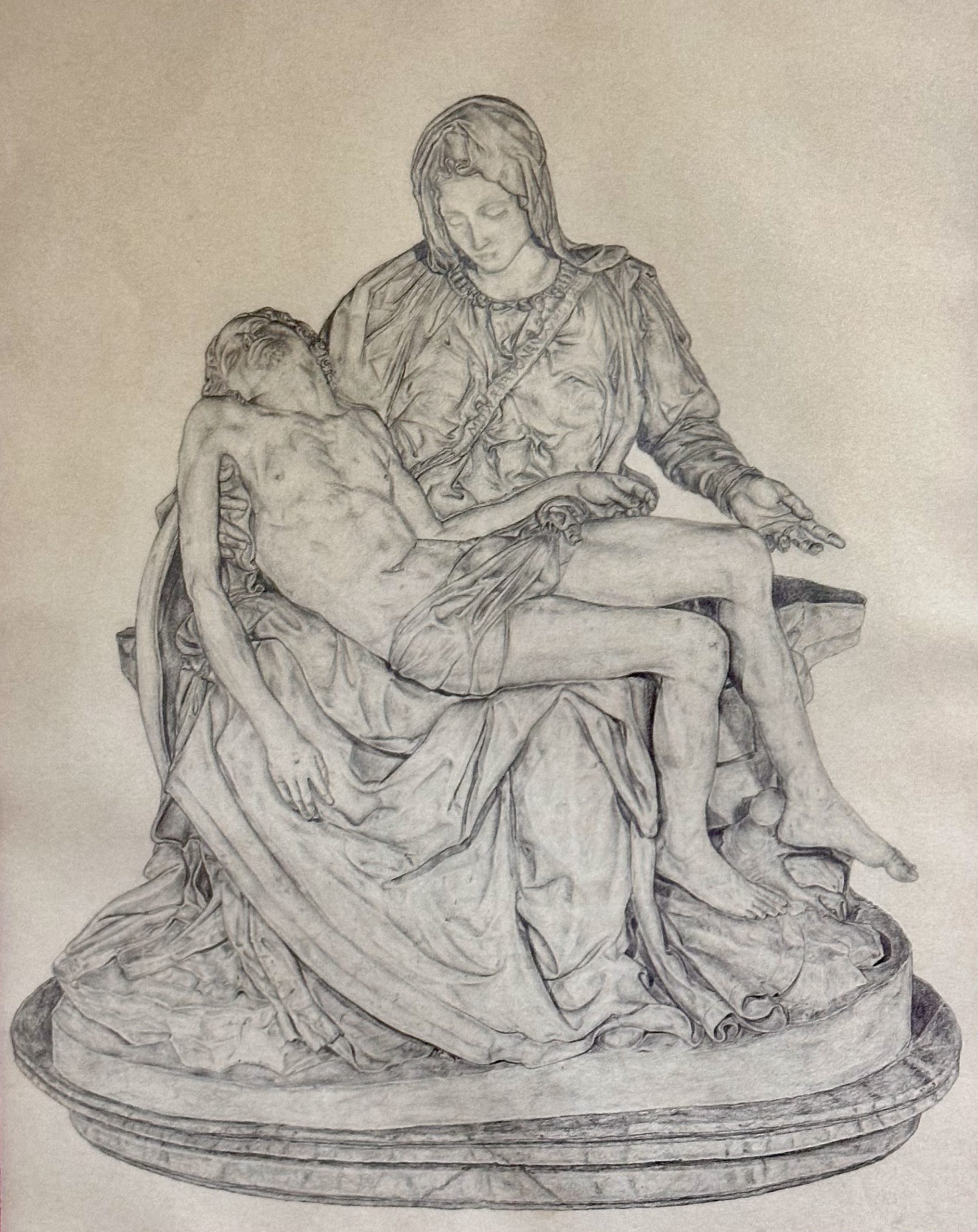 La obra es un dibujo figurativo monocromático que reproduce fielmente «La Pietà» (La Piedad), la famosa escultura renacentista de Miguel Ángel. El dibujo captura el momento en que la Virgen María sostiene el cuerpo sin vida de Jesucristo después de ser bajado de la cruz.